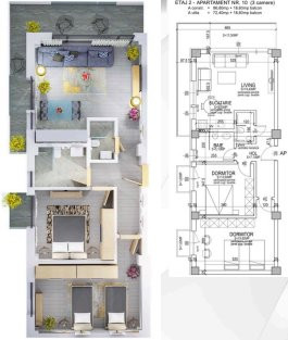 Victory Holding prezintă un apartament de 3 camere, situat in Pipera. Suprafața utilă este de 73 mp, completată de o terasă de 17 mp și două balcoane de câte 1,6 mp. Compartimentarea este practică: living de 19,4 mp, două dormitoare (13,6 mp și 19,8 mp), bucătărie separată, baie, grup sanitar și hol spațios. Apartamentul beneficiază de finisaje premium, eficiență energetică și confort de nivel înalt. Preț: 298.000 € + TVA.