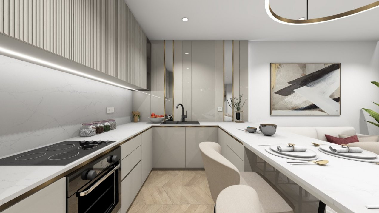 La parter, veți fi întâmpinați de o zonă de zi generos dimensionată, unde bucătăria open-space se conectează fluid cu livingul, creând un ambient luminos și primitor, perfect pentru întâlniri cu prietenii sau momente de relaxare în familie. Din acest spațiu, aveți acces direct la terasa exterioară, un loc ideal pentru a savura cafeaua de dimineață sau pentru a vă bucura de serile calde de vară.